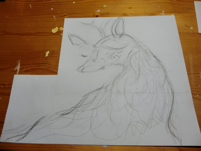 パネルやキャンバスなど、どんな素材で制作するにしろ、私は下書きの段階で自分にしか分からない情報をたくさん書き込んでしまうので、仕上がりにも響いてしまうぐらいに画面(完成作品)が汚れてしまいます。なので、事前に同サイズに下書きの絵を描いていきます。