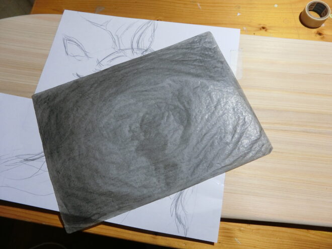 写し絵でよく見かけるトレーシングペーパーに柔らかめの鉛筆(私は6Bのものを使っています)を塗りつぶした?お手製のトレぺ用紙です!